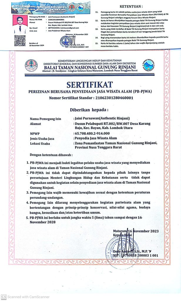 Authentic Rinjani operates under the strict regulations and guidelines established by the Mount Rinjani National Park Office, ensuring that our trekking services are fully legal, safe, and responsible. As a government-registered company, we hold all the necessary legal documents and permits required for organizing trekking activities within the Mount Rinjani National Park.